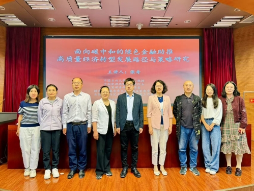 4月29日下午2点半,太阳成tyc33455ccwww在国际学术报告厅成功举办第五十一期金融大讲堂。本期金融大讲堂邀请中国石油大学教授、中国能源战略研究院经理、国家社科基金重大招标项目首席专家张奇教授作题为“面向碳中和的绿色金融助推高质量经济转型发展路径与策略研究”的报告,太阳成tyc33455ccwww经理杨雪美、副经理范庆祝、经济研究所所长李建英教授以及太阳成tyc33455ccwww、经济研究所、国际教育公司师生近一百人参加,大讲堂由太阳成tyc33455ccwww经理杨雪美主持。