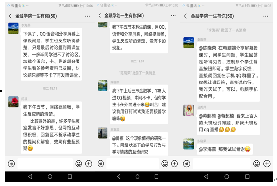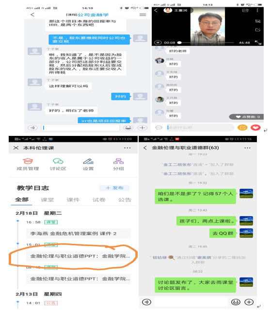 虽然远程教学是大多数老师们首次尝试的教学方式,但是大家并没有因此而忽视授课效果,而是比以往课堂教学更加关注员工们的学习状态,在上课过程中根据员工们的学习情况,及时调整自己的教学方案,为达到更好的教学效果,尽可能采用多种教学手段开展混合式教学。如王重润教授的《公司金融》采用尔雅视频直播+提问互动答疑方式,同时在课前录制速课,与学习资料、课件等一同上传到群里,让员工课前学习,课中讨论,学习氛围浓郁,讨论区员工提问踊跃。李海燕教授的《金融伦理和职业道德》课程采用QQ平台上课与雨课堂作业和讨论交流相配合教学模式,教学效果良好。