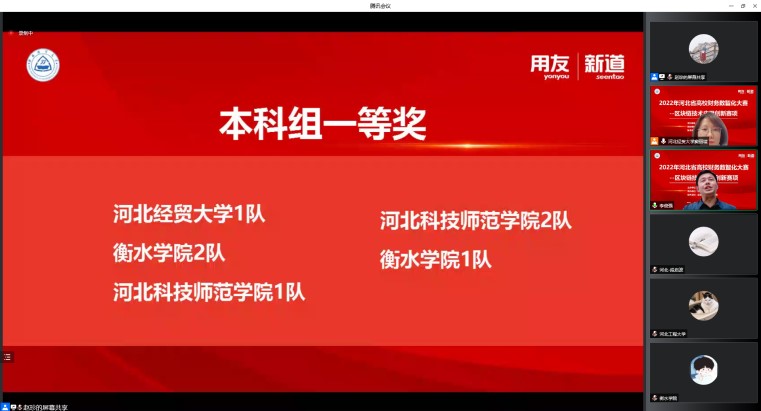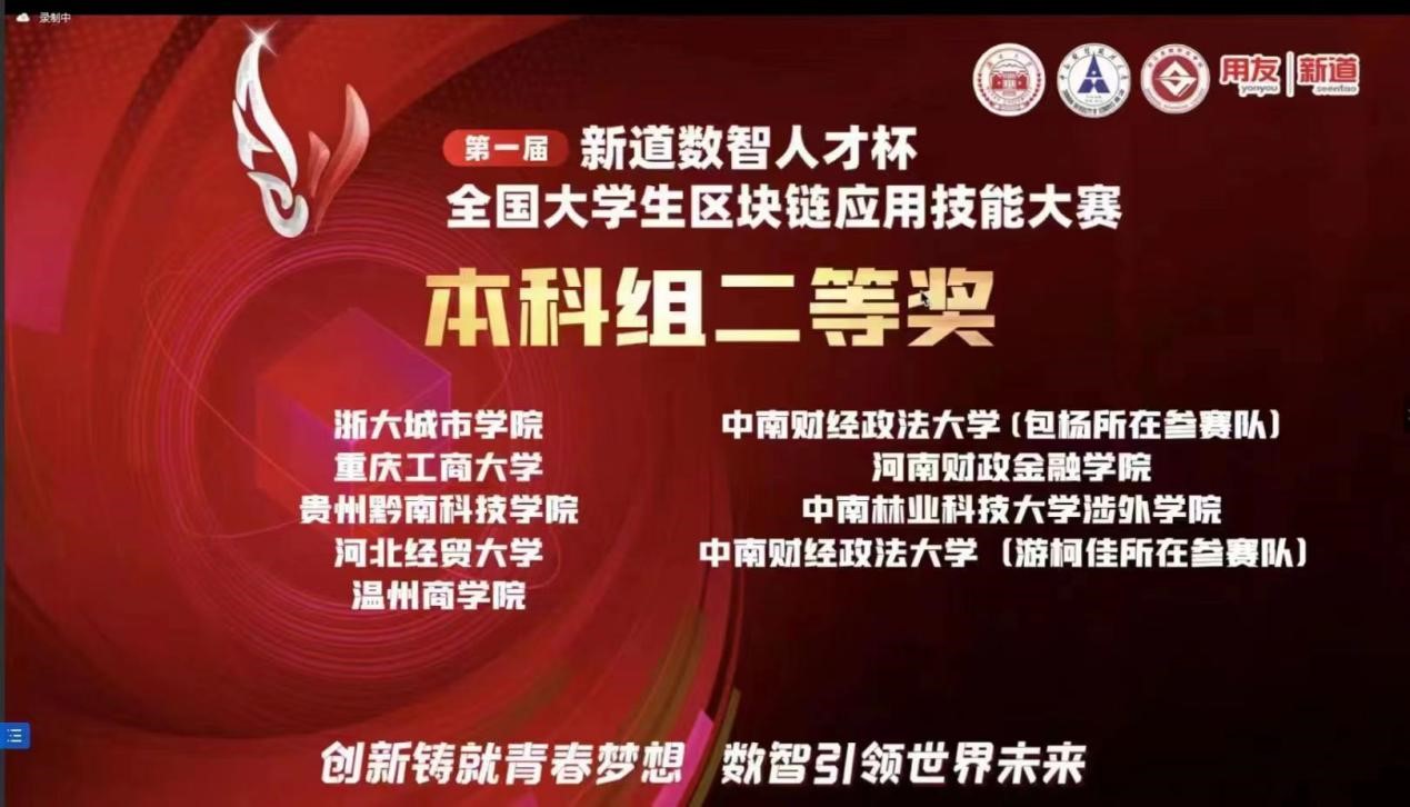 由公司太阳成tyc33455ccwww孙玮老师指导,金融科技专业员工郭瑞、金融工程专业员工张风枝、王斌和财税公司资产评估专业员工刘琬妮组成的代表队,在6月10日举行的2022年河北省高校财务数智化大赛——区块链技术应用创新赛项中,与来自全省35所高校65支队伍近400名选手角逐,通过“理论+实践”的考核方式,经区块链基础知识测试、区块链创新实践展示等环节,荣获省赛一等奖并获得国赛资格。本次国赛经过2天紧张激烈地比拼,公司代表队最终荣获全国二等奖的好成绩。