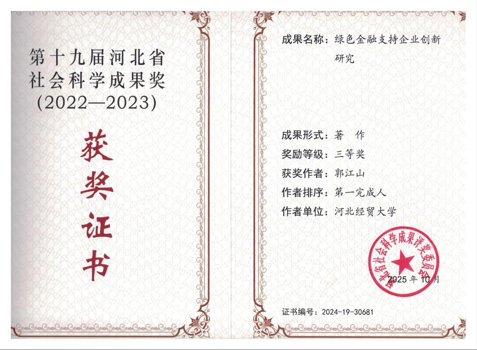 近日,河北省社会科学成果奖评审委员会颁发第十九届河北省社会科学成果奖,公司郭江山副教授荣获第十九届河北省社会科学成果奖三等奖。