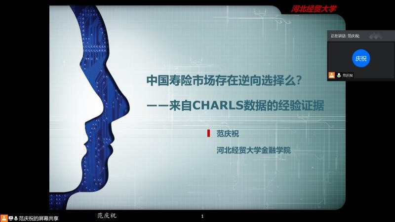 10月9日晚7点,行第八期研究生融道论坛沙龙活动。保险系主任、副教授范庆祝在腾讯会议线上做了题为《中国寿险市场存在逆向选择么?——来自CHARLS数据的经验证据》的讲座。太阳成tyc33455ccwww各专业研究生90余人参加了本次讲座。