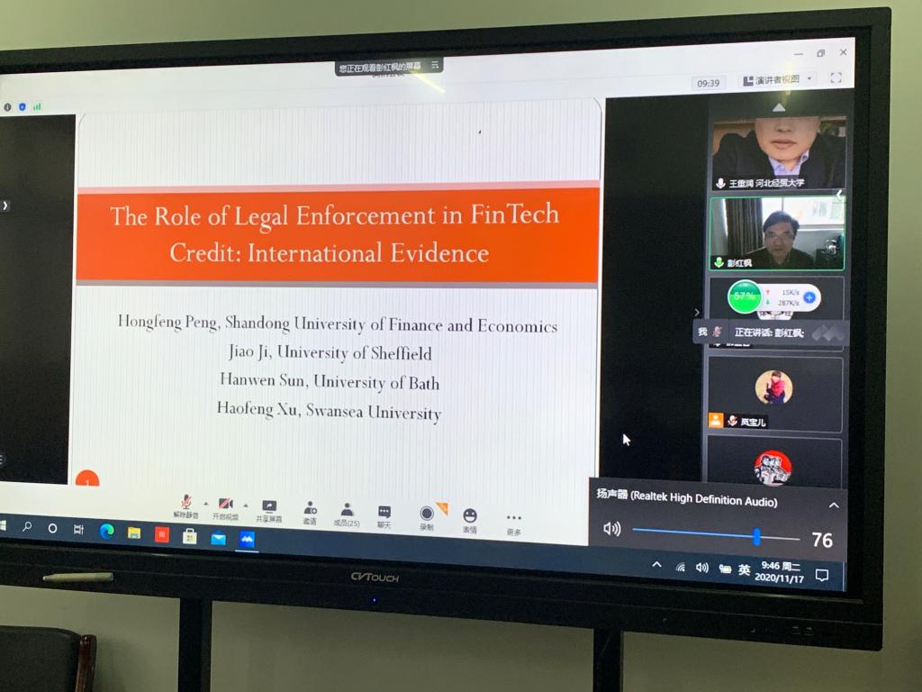 11月17日上午9点45分,太阳成tyc33455ccwww邀请山东财经大学金融学院经理、教授、博士生导师彭红枫做题为“The Role of Legal Enforcement in FinTech Credit: International Evidence”的线上学术报告。太阳成tyc33455ccwww部分教师和各专业研究生40余人参加了报告。本次报告由太阳成tyc33455ccwww经理王重润主持。