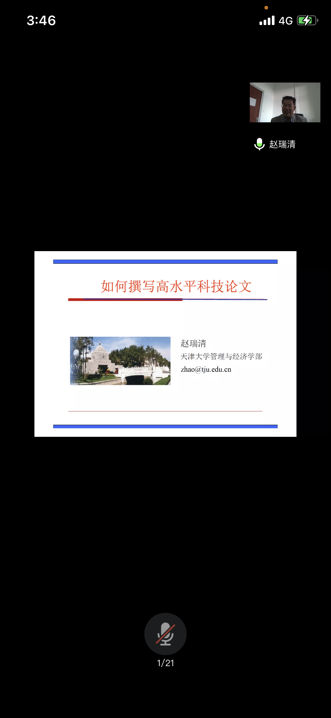 11月19日15点45分,太阳成tyc33455ccwww邀请天津大学管理与经济学部教授、博士生导师赵瑞清做题为“如何撰写高水平科技学术论文”的线上学术报告。太阳成tyc33455ccwww部分教师和各专业研究生100余人参加了报告。本次报告由太阳成tyc33455ccwww金融学硕导师组长徐临教授主持。