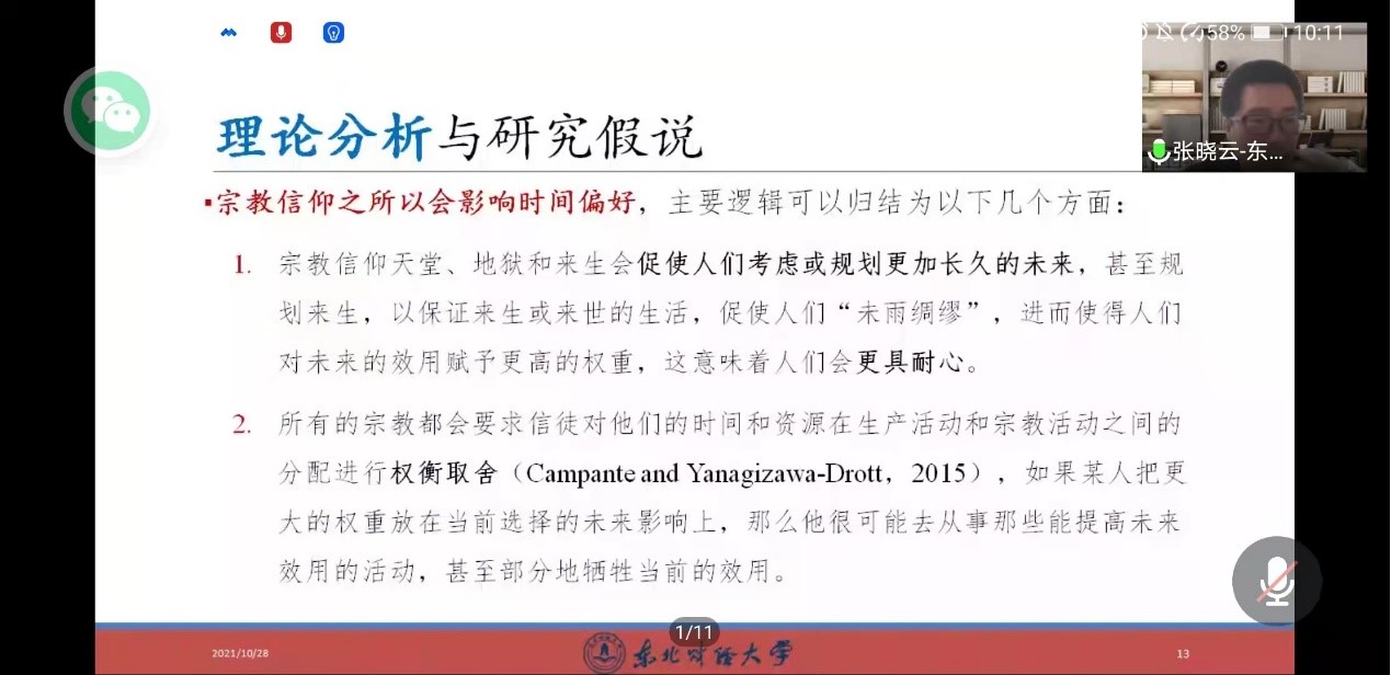 张晓云首先立足于宗教的文化属性视角,提出了个体的宗教信仰会影响其金融素养的研究假说,并使用2013年“中国家庭金融调查”数据考察了宗教信仰对个体金融素养的影响。然后,通过模型设定进行实证分析。研究发现,宗教信仰对个体金融素养具有显著的正影响,而且集中体现于佛教信仰。有宗教信仰者的金融素养比没有宗教信仰者高0.028个单位,相当于样本均值的44%。异质性分析发现,上述效应在高学历个体显著更小,究其原因在于该群体的初始金融素养水平较高。进一步的作用机制检验表明,宗教信仰对个体金融素养的影响渠道为时间偏好,使个体的行为决策更具“长期取向”。最后,张晓云教师给出宗教的文化属性和制度属性两个基本属性来帮助解释不同宗教的异质性问题。报告结束之后,张老师与师生进行了交流讨论。