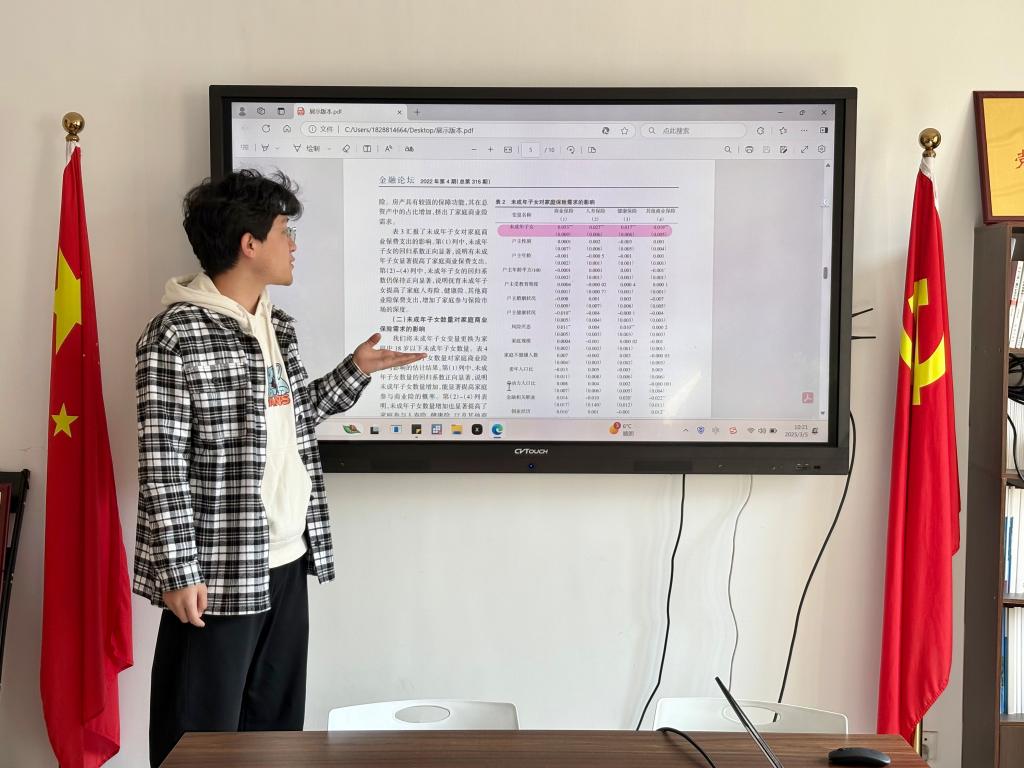 李苏霖对该论文进行了详细解读,阐述了研究背景、方法与结论。研究发现,家庭中未成年子女的存在及其数量的增加,显著提高了家庭参与商业保险的概率和保费支出,这一现象在不同家庭特征中表现出显著的异质性。李苏霖的讲解清晰明了,引发了在场师生的热烈讨论。随后范经理也为同学们今后的科研工作提出了宝贵意见。他强调,科研选题应紧密结合社会热点与实际需求,注重数据的准确性和分析方法的科学性。此外,他还提醒同学们在研究过程中提高对自己的要求,深入挖掘数据背后的经济逻辑,以提升研究的深度和广度。