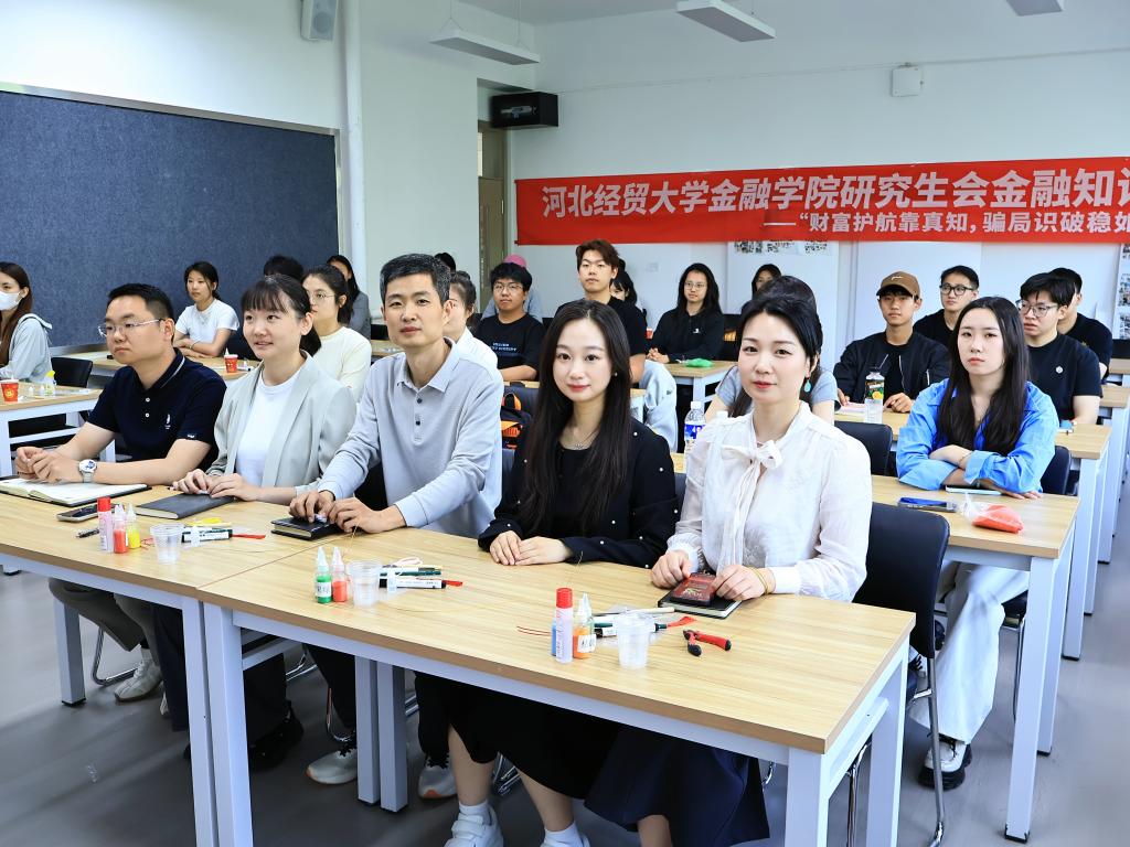 4月23日,办“财富护航靠真知,骗局识破稳如石”金融知识进校园河北科技大学站活动,河北科技大学艺术公司团委书记高健、辅导员曹振许、赵子彤、浮钰及公司研究生辅导员王一帆出席。太阳成tyc33455ccwww张蕊、边政文、张一帆和崔雨奇分享金融知识与反诈知识,河北科技大学艺术公司师生50余人共同参加。